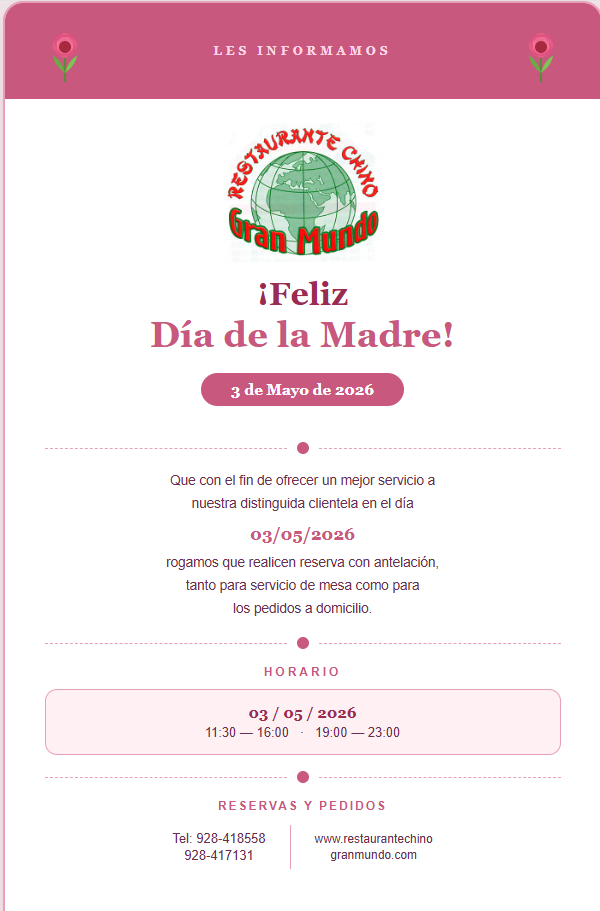 Que con el fin de ofrecer un mejor servicio a nuestra distinguida clientela en el día de la madre (03/05/2026), rogamos que realicen reserva Con antelaciónón, tanto para servicio de mesa como para los pedidos a domicilio.